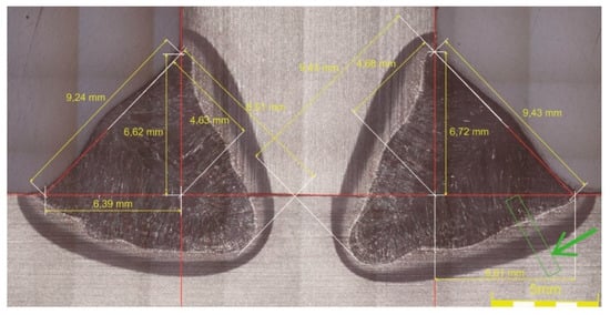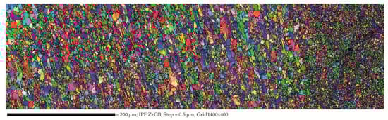 Figure 6 shows a metallographic scratch pattern, including the basic geometric evaluation of the individual runs. An EBSD analysis was performed on the weld on the Run 1 to determine the grain size during the transition from the weld through the HAZ to the parent material. In the EBSD analysis, a total area of 0.6 × 4 mm2 was scanned, and this is shown in Figure 6 by a green rectangle and a green arrow. A detail of the grain coarsening in the high-temperature HAZ is shown in Figure 7.