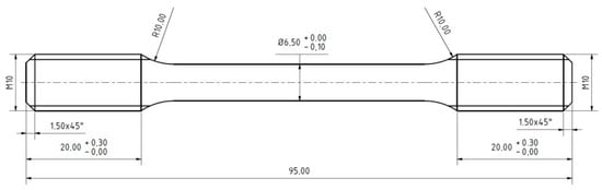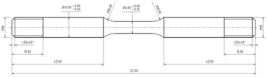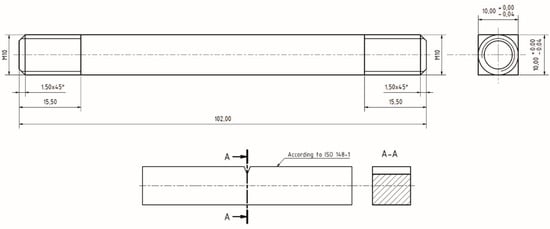 Other test specimens were designed and manufactured is such way that it was (in the Gleeble 3500 thermomechanical simulator, Dynamic Systems Inc., Poestenkill, NY, USA) possible to apply them for the experimentally measured temperature cycle with a maximum temperature of 1383 °C. This was a sample for a static tensile test (Figure 9) and a Charpy impact test (Figure 10).