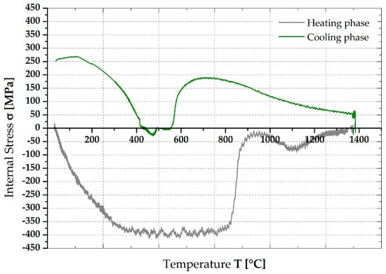 The temperature vs. stress course for the zero dilation sample designed for the static tensile test is shown in Figure 11. It is evident that, from a temperature of about 300 °C, the sample was already deformed plastically. Then, in the temperature range of 750–900 °C, the internal stress in the sample was significantly reduced due to decrease of yield strength, as well as phase transformation. The thermal expansion of the sample was here accompanied by further plastic deformation. When the maximum temperature of 1383 °C was reached and the cooling of the sample began, the compressive stresses were transferred to the tensile ones. During cooling of the sample, one significant drop in the sample stresses appeared in the temperature range corresponding to the phase transformation. This was already visible from the course of real temperature cycle.