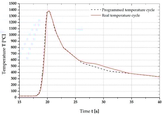 The overall setting of the sample in the Gleeble 3500 before the application of the temperature cycle is shown in Figure 12. The detail of the programmed (black dashed line) and real (red line) applied temperature cycle is shown In Figure 13. From Figure 13, is clear that the real temperature curve had a slight delay behind the program in the heating section. At the beginning of the cooling phase, the real sample temperature copied the program up to 600 °C, when, due to the latent heat release during the austenite transformation, it was not possible to cool the sample sufficiently enough with just Cu high temperature jaws. At a temperature of 400 °C, the cooling rate continued to follow the programmed temperature cycle.