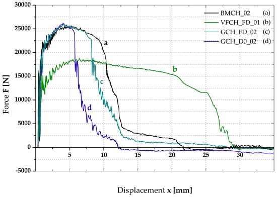 Force vs. displacement for the Charpy impact test for following samples (a) BMCH_02; (b) VFCH_FD_01; (c) GCH_FD_02; and (d) GCH_D0_02.
