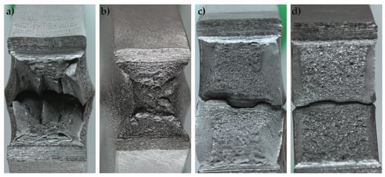 The discussed problem is also evident from the dependence of the force on the displacement during the Charpy impact test (Figure 14) and the corresponding types of fracture surfaces. Figure 15 shows these fracture surfaces of relevant samples.