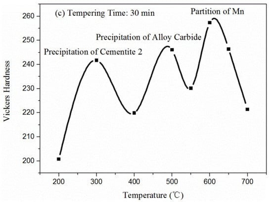 - The tempering process of low-carbon 700 L included the following six stages—carbon segregation and cementite I precipitation, retained austenite decomposition, cementite II precipitation, cementite dissolution, alloy carbide precipitation, and Mn partitioning. In addition, three hardness peaks appeared in the cementite II precipitation, alloy carbide precipitation, and Mn partitioning stages.