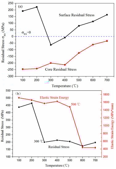 - 700 L has two distinct residual stress adjustment stages during tempering, which are related to the transformation of the microstructure. The first stage overlapped with cementite II precipitation, and the absolute value of residual stress was reduced from 487 MPa to 200 MPa; however, the elastic deformation energy remained unchanged. The second stage was for temperatures of 450–650 °C, and the absolute value of residual stress was reduced to 174 MPa. During this stage, the elastic deformation energy was reduced by 72.72%.