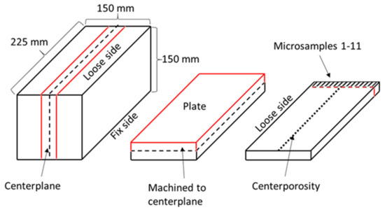First, a central plate of about 20 mm width was cut from the billet sample. The orientation of the plate is indicated in Figure 1. The loose side corresponds to the upper side of the billet and the fix side corresponds to the lower side. The plate was then machined to the center plane, where the center porosity was revealed. This resulted in a plate with the dimensions L × W × H. 225 × 150 × 10 mm. To produce micro samples, a slice was cut from the plate and then divided into cross-sectional samples designated 1–11, where sample six included the billet center. These samples were then mechanically polished using standard procedures which are common when preparing metallographic analysis samples.