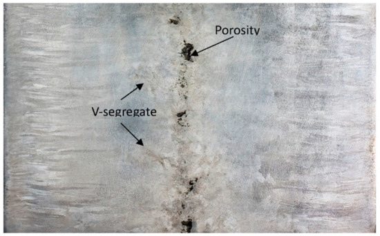 An image of the longitudinal section etched in Marble’s reagent is presented in Figure 2. A columnar structure is seen growing as horizontal lines from the surface region. Closer to the center, the horizontal lines diminish, and thus demarks the beginning of an equiaxed structure. In addition, open porosity and distinct V-segregation pattern are seen along the center line. The center porosity consists of cavities with a width of up to 10 mm and a length of up to 30 mm. The cavities are both isolated and interconnected in the studied plane.