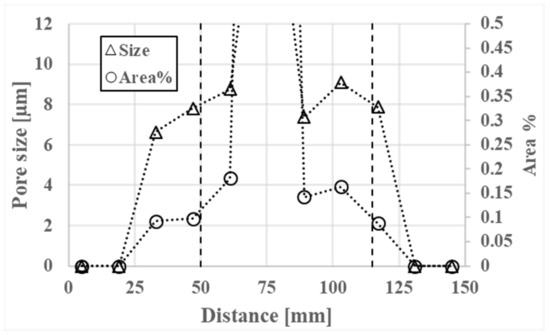 Average size and area% of analyzed porosity from the billet cross section. The horizontal lines show the width of the equiaxed zone.