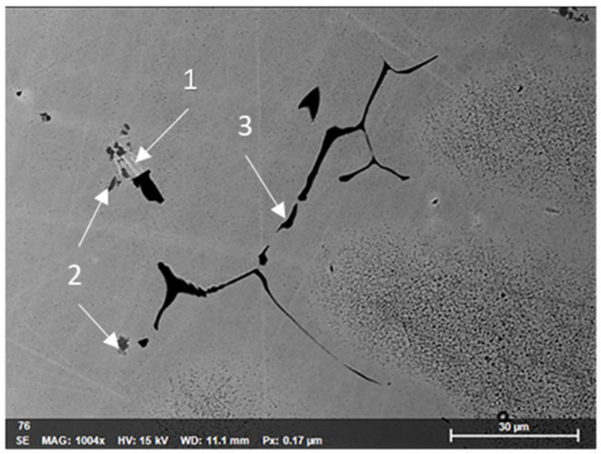 A 500× magnification of a pore, close to the center, with the shape of an interdendritic region is shown in Figure 8. Three equiaxed dendrites are visible around the pore. An EDX elemental analysis showed that no precipitate or unusual segregation were found adjacent to the pore boundary.