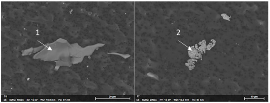 Extracted precipitates showing (1) the morphology of a TiC as a thin flake and (2) a phosphide with an irregular cellular form.
