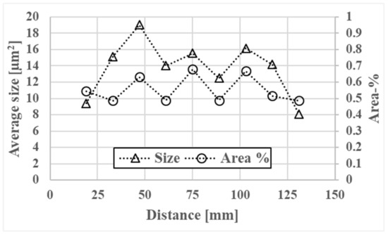 The results from the precipitation analysis on LOM images (see Figure 13) show that the area fraction of precipitates averages 0.55 and changes little over the cross section. The area of each precipitate, which was determined by the total precipitate area over the number of precipitates, coincides with the measured SDAS values over the cross section.