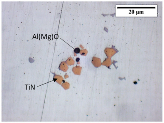 Clusters of inclusions, as seen in Figure 14, are often observed together with black particles. These clusters of inclusions are common, close to the surface. However, they are also found infrequently in the whole cross section. Elemental analysis showed that the black particles were Al2O3-MgO spinel phase and the surrounding orange particles were TiN.