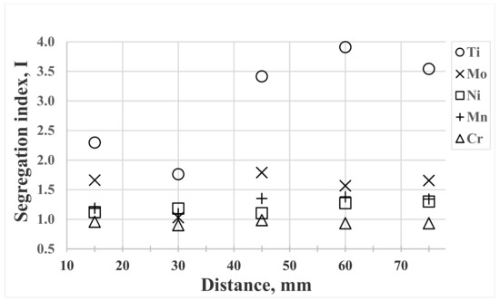 The segregation index for each element as a function of distance from billet surface is shown in Figure 16. The element that is most sensitive to segregation is Ti with values between 1.7 to four, followed by Mo, Ni, and Mn also having values above one. However, Cr has values at around one or slightly below. At 30 mm there is a significant drop of the segregation index for Ti and Mo, which happened to be at the same distance as pores appears in the structure. Table 4 shows the difference between the segregation index at 15 mm and 60 mm from the surface, which corresponds to SDAS values of approximately 20 μm and 70 μm, respectively. The segregation indices for Mo, Ni, Mn, and Cr are approximately the same for the two different arm spacings but increases significantly for Ti at larger SDAS values.