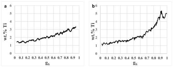 Measured Ti content at (a) 15 mm and at (b) 60 mm from the surface.