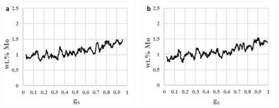 Measured Mo content in at (a) 15 mm and at (b) 60 mm from the surface.
