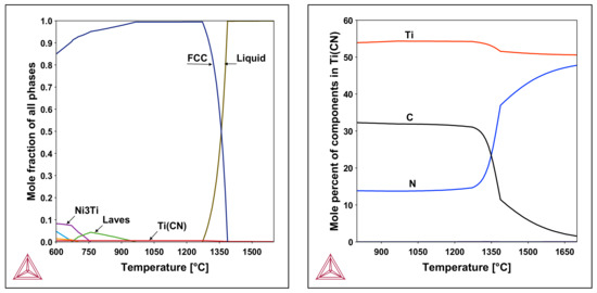 Equilibrium phases and composition of the Ti(CN) phase as calculated with Thermo-Calc, database TCNI8.1.