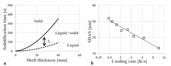 (a)The calculated solidification time against shell thickness and (b) measured secondary dendrite arm spacing (SDAS) against calculated cooling rate.