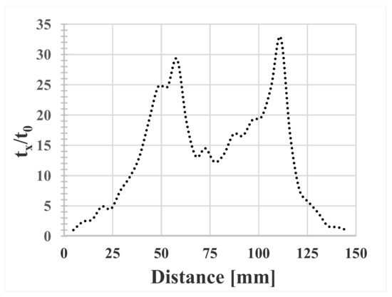 where , is the diffusion constant and is the homogenization time, which will give a rough estimate of the time it takes to homogenize the cast product. The difference in diffusion time in the cross section is written as the ratio between the SDAS value at an increasing distance, x, from the surface, , and the SDAS value at the surface, , such as: