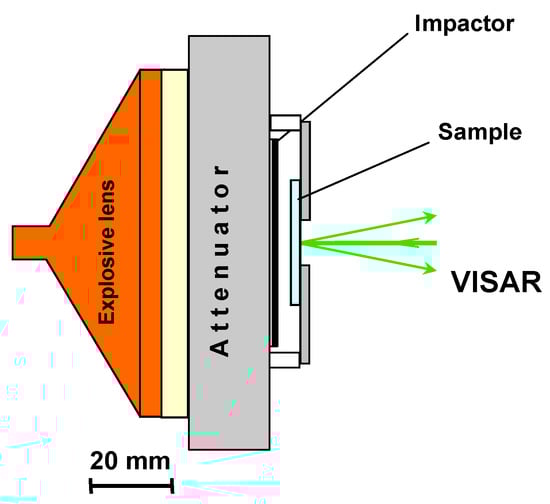 Figure 2 demonstrates the experimental assembly for the shock-wave loading of the tested specimens. The shock wave generators provide the necessary loading conditions and the high degree of homogeneity for the sample deformation, which was achieved by the impact of parallel-sided plates. Under such loading, the shock wave is excited in the sample, after which a constant state is maintained during the time of wave circulation in the impactor.