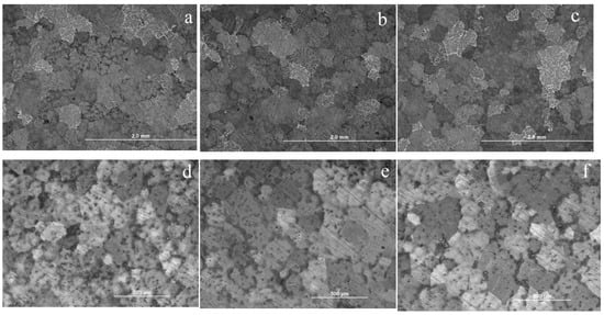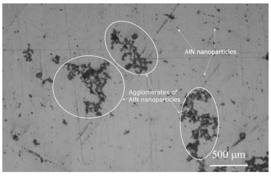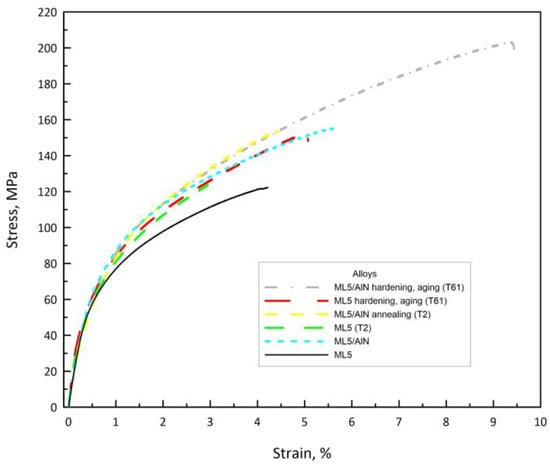 The obtained samples of the alloy ML5 and the composite ML5/AlN were subjected to heat treatment T2 (annealing) and T61 (hardening and aging) in air. The annealing was conducted at a temperature of 280 °C for 4 h, and heating and cooling were carried out in the muffle furnace. Before hardening, the specimens were heated at a temperature of 370 °C for 2 h, followed by cooling in water with a temperature of 60 °C. After hardening, the samples were subjected to aging at a temperature of 170 °C for 4 h, followed by cooling in the furnace.