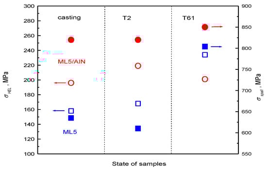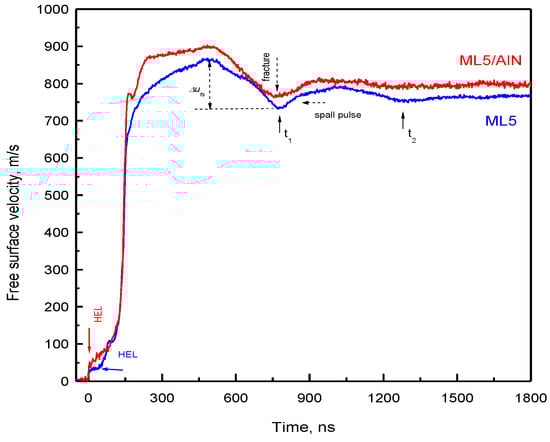 Figure 10. It can be seen that the highest value of the Hugoniot elastic limit was received with the samples after hardening and aging. The heat treatment of the composites ML5/AIN had little effect on the parameters of the elastoplastic transition. The strength properties of the samples varied depending on their structural state. The hardening and aging of the alloy samples ML5 allowed for a significant increase of the spall strength and practically achieved the strength of the metal-matrix composite after casting and annealing.