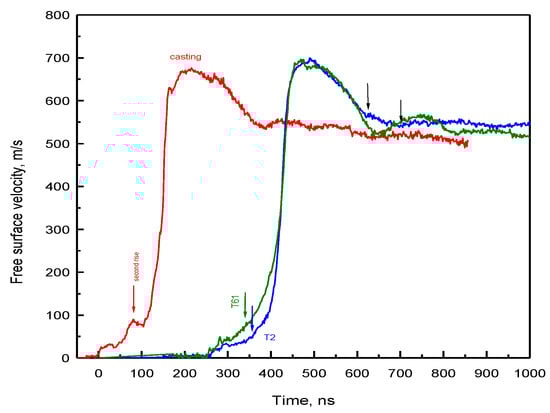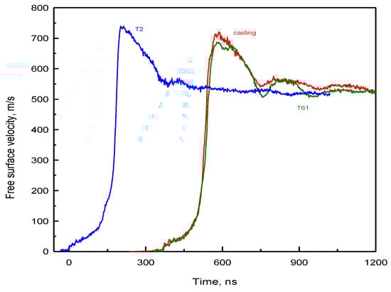 Figure 6, which, in both cases, was due to the heterogeneity of the structure of the alloy ML5. An increase in the Hugoniot elastic limit compared with the samples after casting from 158 to 168 MPa was shown on the free surface velocity profile of the sample of the alloy ML5 after annealing (