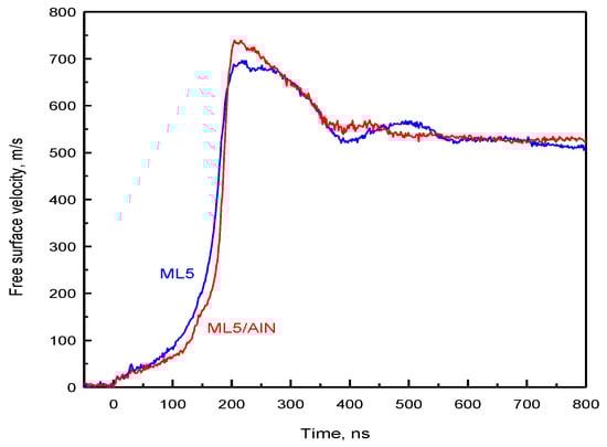 The free surface velocity profiles for the samples of the magnesium alloy ML5 in comparison with the metal-matrix composite ML5/AIN after the heat treatment, namely hardening and aging, are presented in