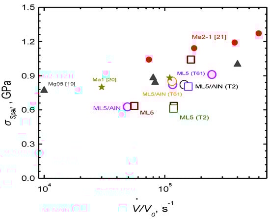 Figure 11, the values of the spall strength of the metal-matrix composite ML5/AlN were almost equal to the spall strength of the deformable magnesium alloy Ma1 [