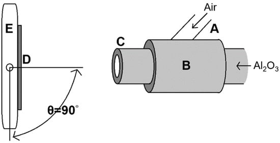 The equipment for particle erosion test. (A: compressed air flow; B: erosion particle (Al2O3 particles) supplier; C: erodent nozzle; D: specimen; E: specimen holder; θ: 90° impact angle).