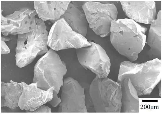 The erosion test equipment is shown in Figure 1. We used irregular Al2O3 particles for erosion test, which had an average particle size of 450 µm. The particle SEM morphology is shown in Figure 2. The specimens were polished with SiC paper (from #80 to #1000) to remove the oxidized layer and were soaked in acetone for ultrasonic cleaning before the erosion test. Two hundred grams of the erosion particles were used under a compressed air flow of 3 kg/cm2 (0.29 MPa). During the erosion test, the AS and HT specimens were eroded at a 90° impact angle to investigate the particle erosion induced phase transformation phenomenon.
