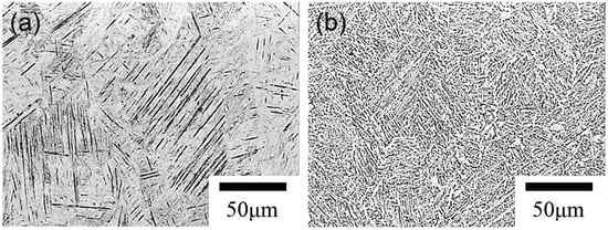 Titanium alloys are widely applied in environments susceptible to erosion, including blades, turbines, and desalination pipeline []. Among them, Ti-6Al-4V is the most representative among the α + β titanium alloys [,], which possesses excellent specific strength, fracture toughness, corrosion resistance, and bio-compatibility []. However, its low thermal conductivity and high reactivity features, which result in its poor machinability characteristics, make it difficult to undertake further exploitation []. In addition, specific heat treatment operations are generally required due to the heat hardening phenomena during the cutting process. Additive manufacturing (AM) technology possesses great characteristics as a new manufacturing technique that is able to lower the cost and reduce energy consumption as well, solving current problems in the fabrication of Ti-6Al-4V and producing a near net shape component [,,]. Powder bed fusion (PBF) process which uses metal powders as a raw material is a type of additive manufacturing (AM) technology. During PBF, metal powders are melted in a specified area with a high-energy laser beam, then it is rapidly solidified at a high cooling rate [,,,,], resulting in its possessing the martensitic α’ phases, which differs from the classical α + β phase structure. In the meantime, the phase transformation takes place when the material is heated.