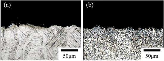 The subsurface morphology of AS at 90° impact angle is shown in Figure 5a. We can observe positively eroded pits formed by erosion particles. There was no obvious relationship between the pits and the needle-like structure. Similar pits can be seen on the subsurface morphology of HT at 90° impact angle (Figure 5b), but the interface of the pits is almost located on the white α phase among the lamellar α + β phases. There is no obvious change in optical microscopy (OM) microstructures on both AS and HT specimens after erosion.