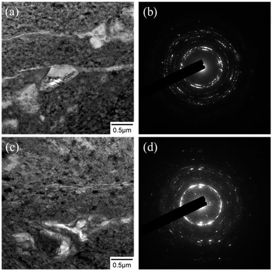 However, the microstructural difference between AS and HT specimens before and after erosion can be obtained through TEM observation. After being positively eroded by endured 90° impact angle, these two specimens are labeled as ASE and HTE, respectively. The α’ phase of AS specimen, as shown in Figure 6a,b, shows the selected area electron diffraction (SAED) pattern of α’ phase. Α + β phase comes up in HT specimen (Figure 6c), the thickness of α phase is approximately 1.5 µm. The SAED pattern of β phase is shown in Figure 6d. Figure 7 shows TEM images of AS and HT specimens after erosion. In short, the microstructures after erosion are completely changed. Figure 7b,d illustrate the well-defined ring pattern indicating fine grains within the region selected.