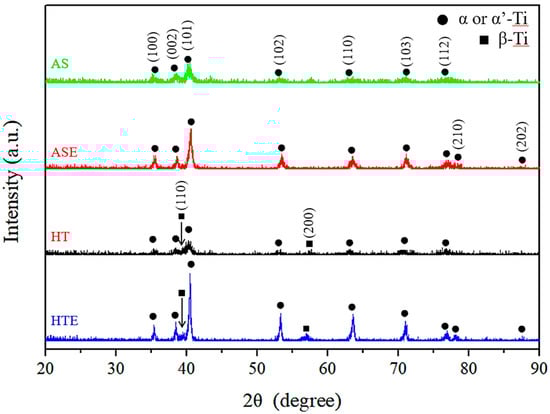 Figure 8 displays the XRD diffraction analysis of the AS, and HT after the positively eroded endured 90° impact angle. Note the respective label changes to ASE and HTE. Both Figure 8 and the previous reports [,,,] suggest the following observation about the presence of the α/α’and the β peaks in HT: when an AS specimen is heated to 800 °C, the α’ phases disappear, and then transforms to continuous lamellar α + β phases. Notably, ASE and HTE had two more peaks (210) and (202) than AS and HT. It was confirmed that the martensitic α’ phase was generated when the temperature gradient grew extremely high during the cooling process. The α’ phase has completely transformed into the α + β phases during heating to and maintaining at 800 °C. Thereby, it is suggested that both of ASE and HTE generated a new α phase after the Al2O3 particle erosion-induced phase transformation. The new generation phase ratios of ASE and HTE were 9.2% and 7.4%, respectively, which indicated that more α phase formation was induced in AS than in HT.