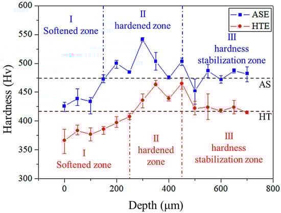 The hardness distribution along the longitudinal direction of ASE and HTE is shown in Figure 9. The full erosion subsurface can be divided into three zones: (1) the softened zone of the outermost surface, (2) the hardened zone below the softened zone, and (3) the hardness stabilization zone down to the bottom. The softened and hardened zone thicknesses for ASE were 150 µm and 300 µm, respectively. The Vickers hardness of the three zones were 420 to 430 HV, 500 to 540 HV, and 450 to 480 HV, respectively. Similarly, the softened and hardened zone thicknesses for HTE were 250 µm and 200 µm, respectively. The Vickers hardness of the three zones were 360 to 380 HV, 430 to 460 HV, and 410 to 420 HV, respectively. The decline in the hardness of the near-surface zone can be attributed to a compound effect: The AS material was transformed from a hard martensitic α’ phase to a soft α phase, and the positive erosion produced a thermosoftened layer. According to previous reports [,], the hardness of the double phase Ti-6Al-4V alloy decreases with the rate of the α phase, which can be attributed to a new α phase formation and the thermal compound effect caused by particle impact []. The formation of the hardened zone can be attributed to positive erosion caused by the downward pressure of the specimen surface.