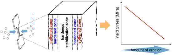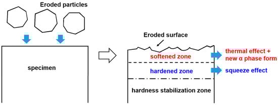 In summary, the positive erosion (by Al2O3 particles) induced a phase transformation for both AS and HT toward generating a soft α phase. At the same time, the softened zone with a thickness of 150 to 250 µm was formed by the thermal effect of the positively eroded particles, and the hardened zone below the softened zone was formed by a squeeze effect, as shown in Figure 10. Because the AS specimen had a higher rate of the α phase induced by eroded particles, the hardness difference between the softened and the hardened zones grew larger than that for the HT specimen.