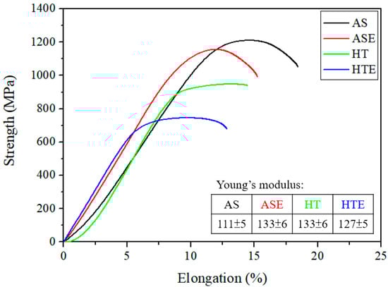 Stress–strain curve of AS, ASE, HT, and HTE.