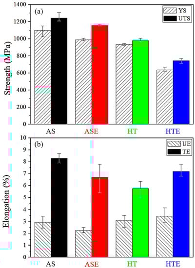 Tensile properties of AS, ASE, HT, and HTE: (a) strength (b) ductility.