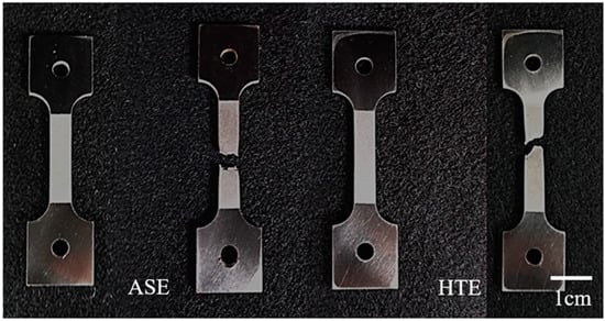 To clarify the effect of erosion-induced phase transformation on tensile mechanical properties, the tensile fracture surfaces after erosion were observed. We found no obvious shrinkage phenomenon in ASE and HTE as tensile test specimens. The macroscopic fracture morphology of ASE is flatter, while HTE shows an oblique line of fracture, see Figure 13.
