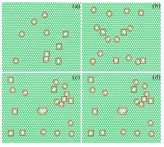 Eventually, for a more authentic irradiation process, the incident position of the particle is randomly generated by the computer, and then the particle occurs on the surface of graphene. After each incident particle is completed, the model relaxes by 1 pico-second (ps). The initial temperature of the model is restored to 300 K, and then the next particle is incident on graphene until the radiation dose is complete. In this paper, graphene is irradiated at random positions by 10, 20, 30, and 40 carbon atoms, respectively. After irradiation, many empty defects are formed in graphene, as shown in Figure 1.