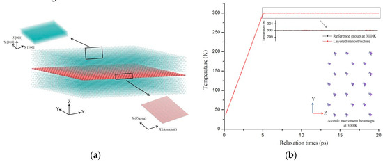 Graphene/copper layered composites. (a) Perspective side-view of graphene/copper layered composites model. Blue color represents copper atoms and red color represents carbon atoms. (b) Relaxation process of layered composites.