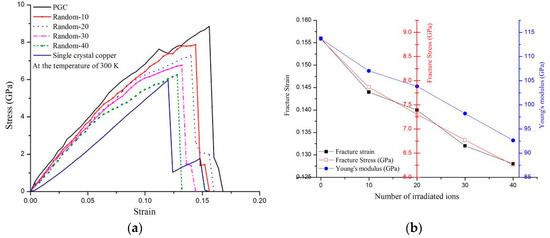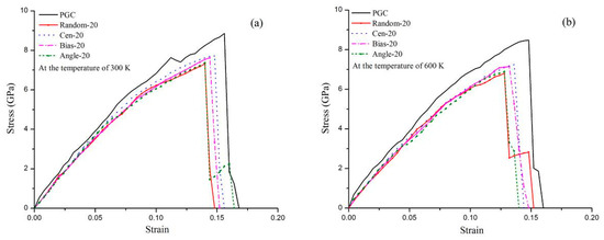 Stress-strain curves and mechanical values of graphene/copper layered composites and single crystal copper are shown in Figure 3. It is noted that the failure strength of the PGC is 8.86 GPa at 300 K, while the failure strength of pure copper is 6.19 GPa in the same condition. Compared with pure copper, the failure strength of is increased by 43.13%. Clearly, graphene as a reinforcement material greatly improves the strength of monocrystalline copper. However, graphene is prone to defects in the preparation process. Therefore, it is necessary to study the effect of defective graphene on the properties of composites. In this section, different locations and types of defects are produced in graphene by using different doses of ionic radiation, including 10, 20, 30, and 40 carbon atoms. Graphene with various defects is then inserted between two copper blocks as reinforcement material. It should be noted that the mechanical values of random −10, −20, −30, and −40 with temperature changes are obtained by an average of three sets of data, respectively.