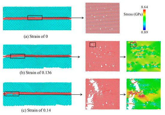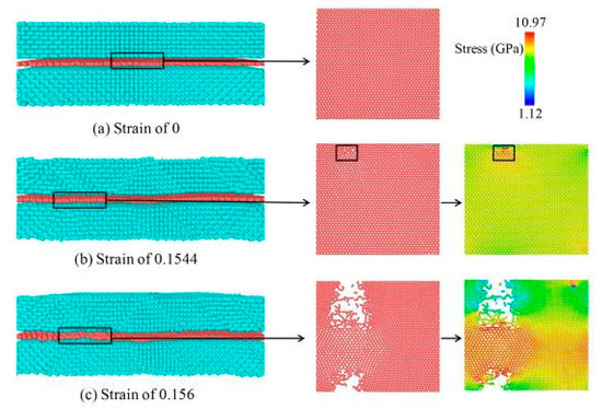 Fracture process and stress distribution of PGC under uniaxial tensile loading at the temperature of 300 K. (a) = 0 before the load is applied. (b) = 0.1544 before reaching the stress limit. (c) = 0.156 after Fracture Failure.