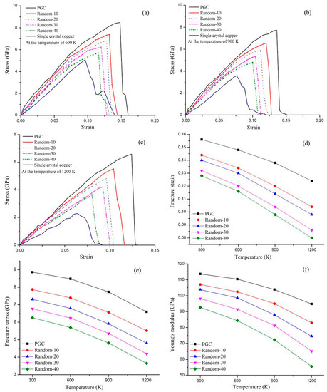 Effect of ion irradiation and temperature coupling on mechanical properties of graphene/copper layered composites in different cases. Stress-strain curve of the simulated model at (a) the temperature of 600 K, at (b) the temperature of 900 K, and at (c) the temperature of 1200 K. (d–f) Variations of fracture strain, fracture stress, and Young’s modulus values of graphene/copper layered composites at different temperatures.