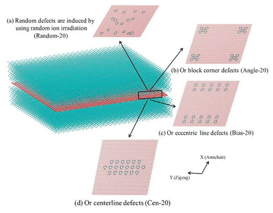 Graphene can be modified and cut during the particle irradiation, and, as a result, it can change the physical and chemical properties of graphene as needed [15,16]. Recent research shows [17,18,19] that the graphene and its composites can be tailored, modified, and structurally designed by using irradiation technology, which can achieve the purpose of precise control performance. For example, the effects of different ions, different incident angles, and different incident energies on the properties of graphene were studied, and the Monte Carlo method for the morphological changes of graphene during irradiation was established by Lehtinen [20]. The effect of ion irradiation on the deformation of graphene was studied by Terdalkar et al. [21] through molecular dynamics simulation. The results show that irradiation energy and irradiation angle play a key role in the type and quantity of defects.