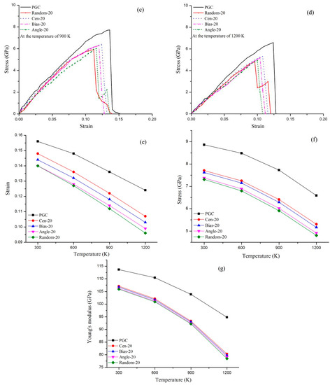 Stress-strain curve of graphene/copper layered composites with different types of defects at (a) the temperature of 300 K, at (b) the temperature of 600 K, at (c) the temperature of 900 K, and at (d) the temperature of 1200 K. (e)–(g) are mechanical values of graphene/copper layered composites with different types of defects at different temperatures.
