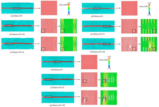 Figure 4 and Figure 5 show the fracture process and stress distribution of PGC and Random-20 under single-axis tensile loads at 300 K temperature, respectively. Clearly, the existence of defects reduces the nature of PGC. At the same time, it was observed that, when the hexagonal elements of graphene were damaged or broken by tensile loads, the composite system was also destroyed. Therefore, we can conclude that graphene plays a key role in the mechanical properties of composite systems. In addition, it should be mentioned that there is a significant difference between the fracture process and the original model of the defective graphene/copper layer composites after irradiation. The graphene/copper layer composites (PGC) break from the edges and extend inward along a straight line. However, the initial fracture position and fracture direction of the defective graphene/copper composite composites after irradiation are closely related to the location of a defect band and atomic lattice vacancies in the defect band.