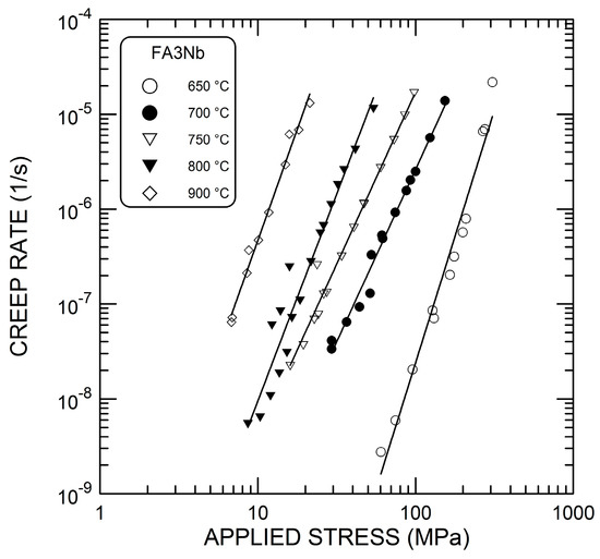 Dependence of the creep rate of the FA3Nb alloy on applied stress.