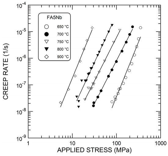 Dependence of the creep rate of the FA5Nb alloy on applied stress.