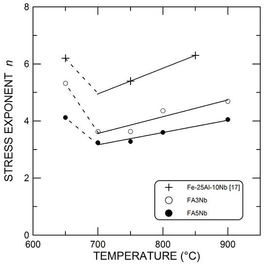 where A is a parameter dependent on the temperature and, and n is the stress exponent. Its values for both investigated alloys are summarized in Figure 5. The exponent n is, albeit slightly, dependent on the temperature. It should be noted that the same temperature dependence of n is evident for the alloy Fe-Al-Nb studied by Milenkovic and Palm [17]. A detailed analysis of the exponent n is possible provided a single mechanism is rate-controlling over the experimental range of stress and temperature. The effect of the mechanism change can be taken into account through an explicit dependence of the exponent n on stress [22]. In the studied alloys, the presence of Laves phase particles introduces threshold stress responsible for an apparent increase of the exponent n at lower stresses and consequently at higher temperatures [23].