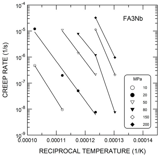 Relations between steady-state creep rate, and reciprocal temperature as derived from the vs. σ relations are shown in Figure 6 and Figure 7. As in the above case of the stress exponent, we can also use the division into two temperature regions here. The apparent creep activation energy, defined as:
